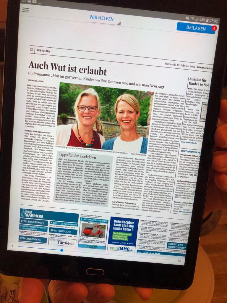 Das Nur Mut!-Team hat eine spannende Interviewanfrage des Ksta (Kölner Stadt-Anzeiger) erhalten. Als Mut-Expertinnen erklären wir auf der "wir helfen"-Seite, was Kinder stark macht und wie sie eigene Grenzen setzen können. Im Speziellen geht es um das von uns angebotene Programm "Mut tut gut" für Vor- und Grundschulkinder, mit dem wir hoffentlich ganz bald wieder persönlich als Trainerinnen in Köln unterwegs sein dürfen. "Wir helfen" ist eine Zeitungs-Rubrik, die immer mittwochs über Initiativen, Einrichtungen oder Menschen berichtet, die sich für Kinder und Jugendliche in unserer Region in besonderem Maße einsetzen. Wir sind sehr stolz darauf, dass wir uns und unsere Arbeit vorstellen durften! Wer den Artikel von Nadja Lissok nachlesen möchte, findet ihn hier. Bitte einfach auf den Link unten klicken.